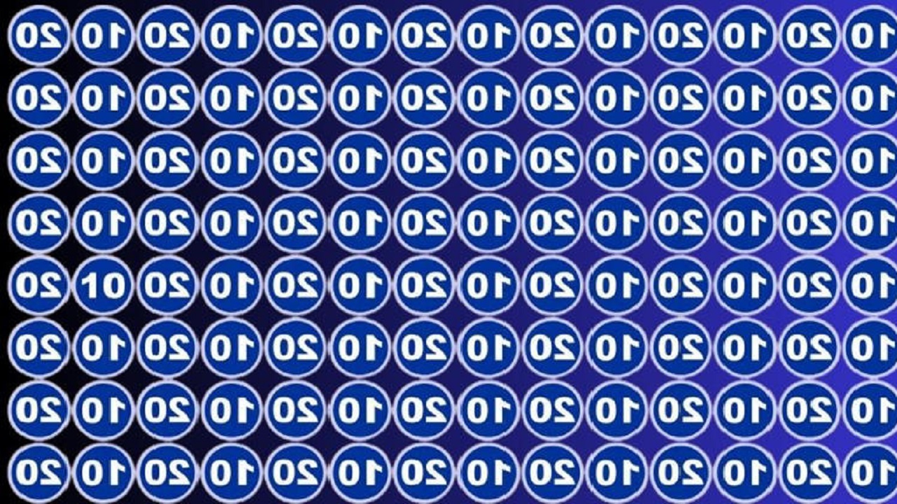 Get ready for a fun brain challenge! This optical illusion features a grid of neat blue circles, each containing either the number 10 or 20 — but everything is flipped upside down. At first look, it appears like a repeating pattern of upside-down 20s filling the entire image. Your task? Find the one normal (non-inverted) “10” cleverly blended into the mix.